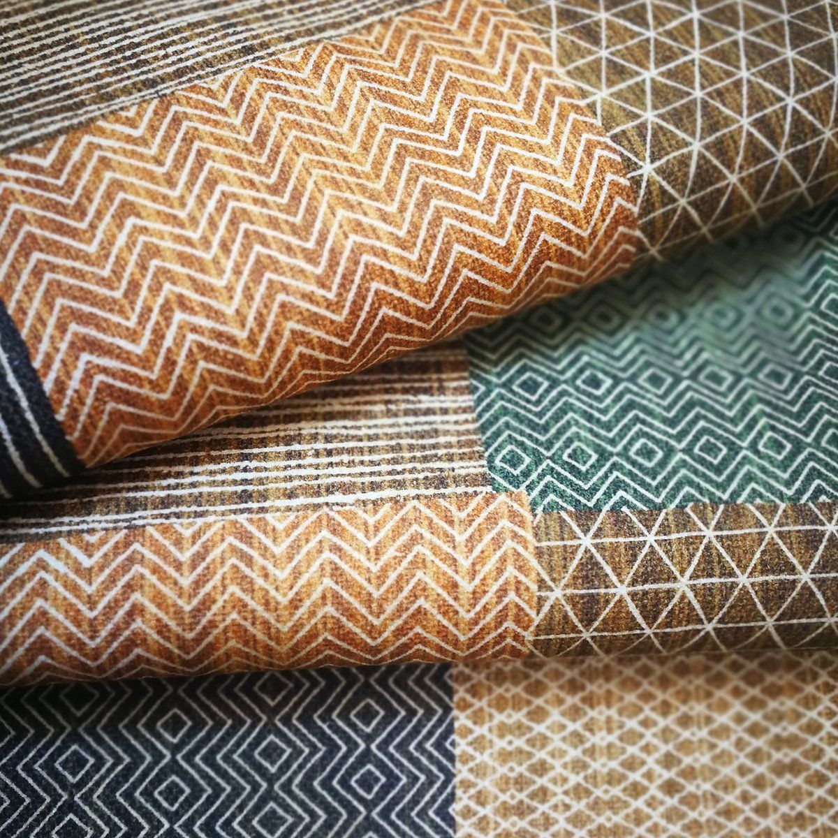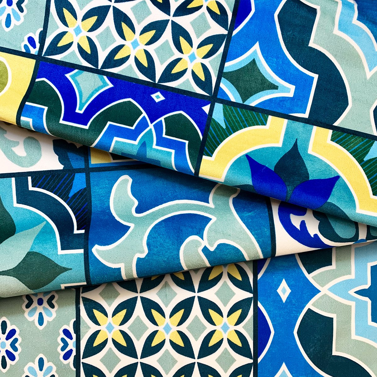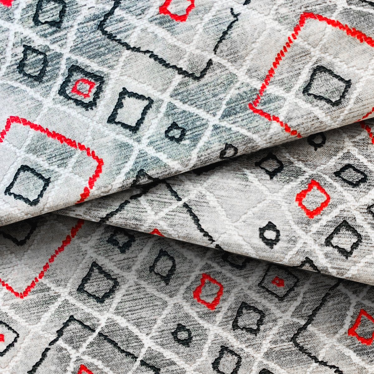 La collection ROMBO est composée d'un tissu en fil 100% coton double épaisseur et imprimé numériquement, ce qui la rend très douce au toucher.