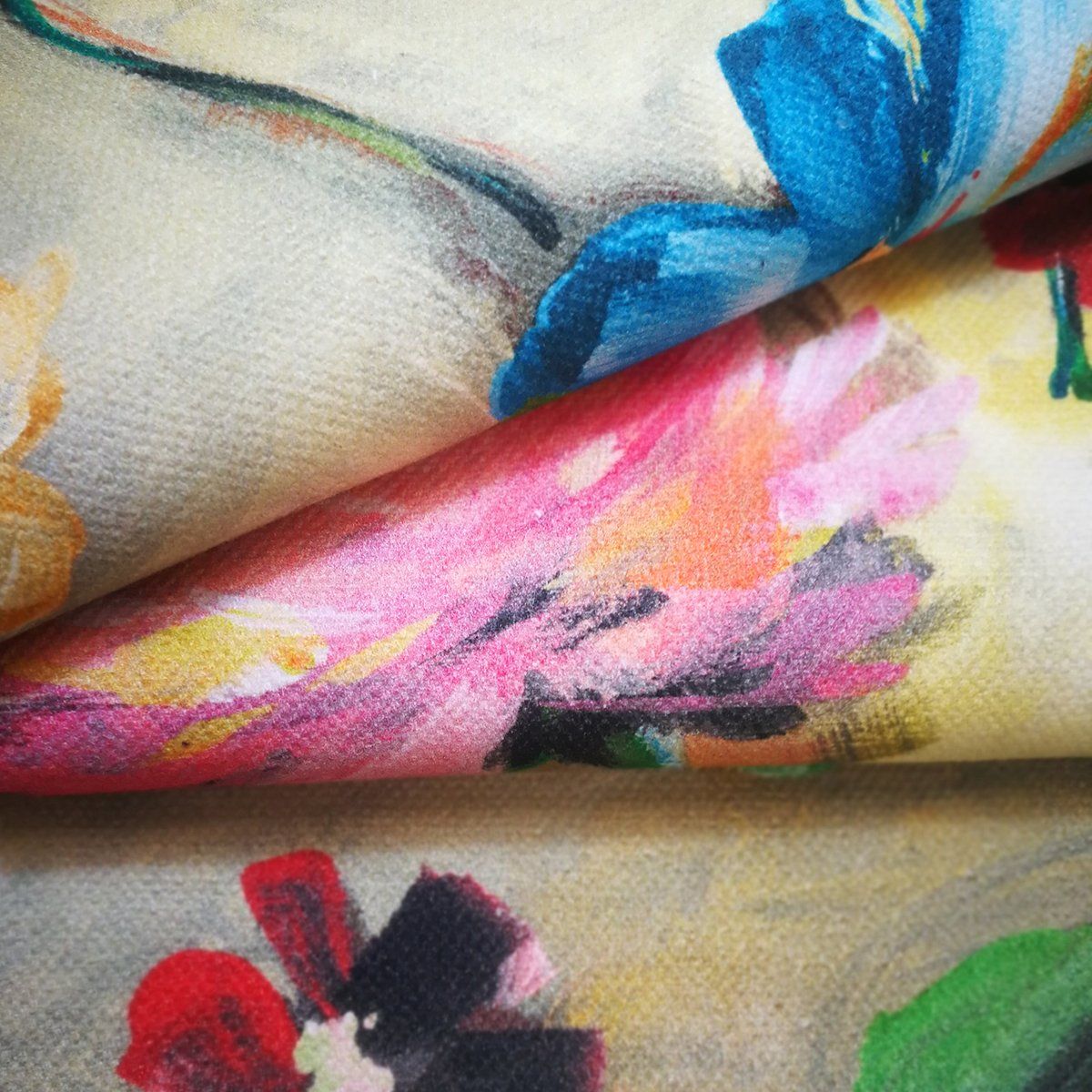 KLIMT est un velours polyester imprimé numériquement, facile à entretenir avec 3 couleurs différentes.